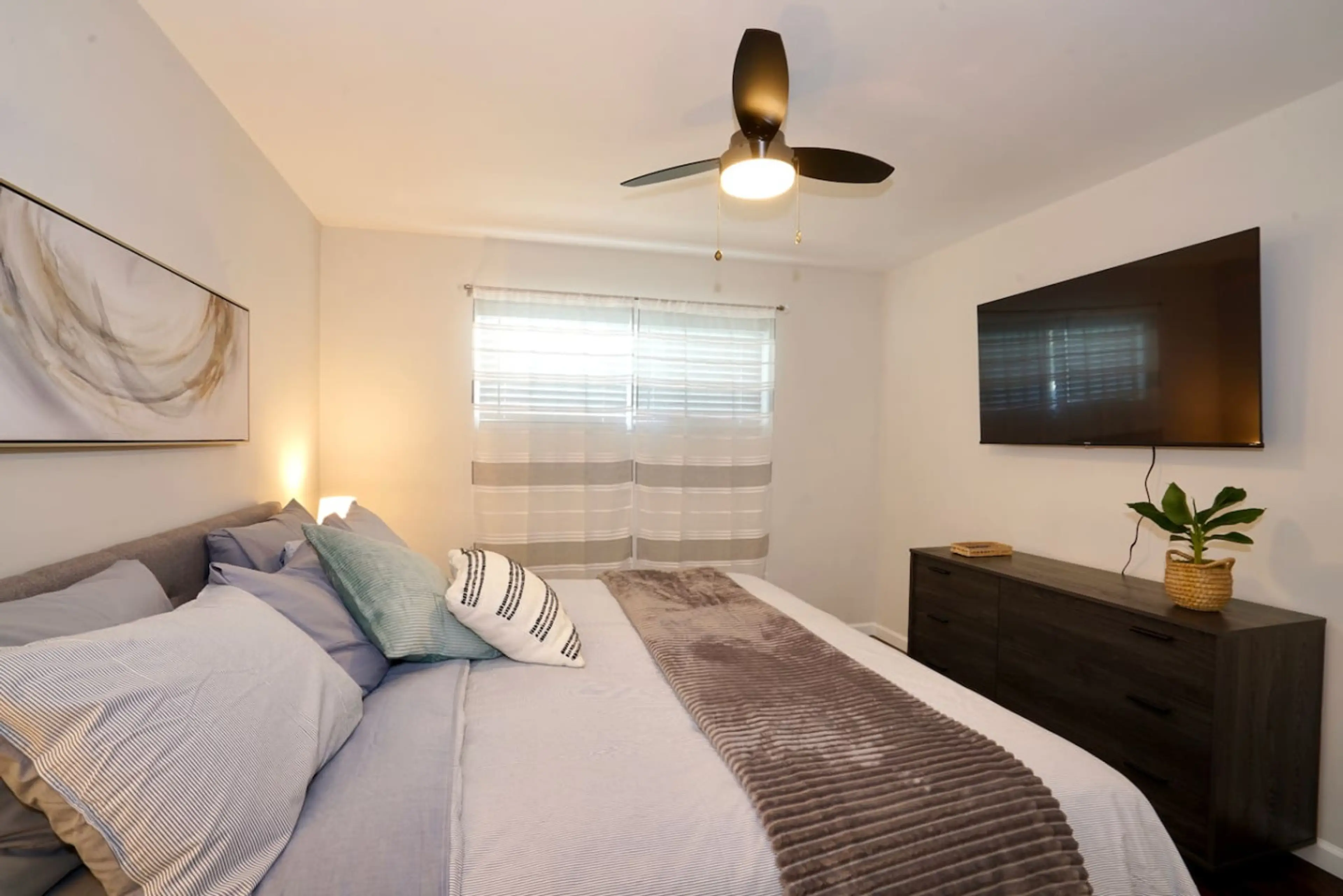 This private home in Linda Vista offers a spacious one bedroom with a king bed a dedicated AC standing unit and newly renovated bathroom and an oversize back yard. The living room features a sleeper sofa and work desk while the fully stocked kitchen and dining area provide everything needed for a co...
